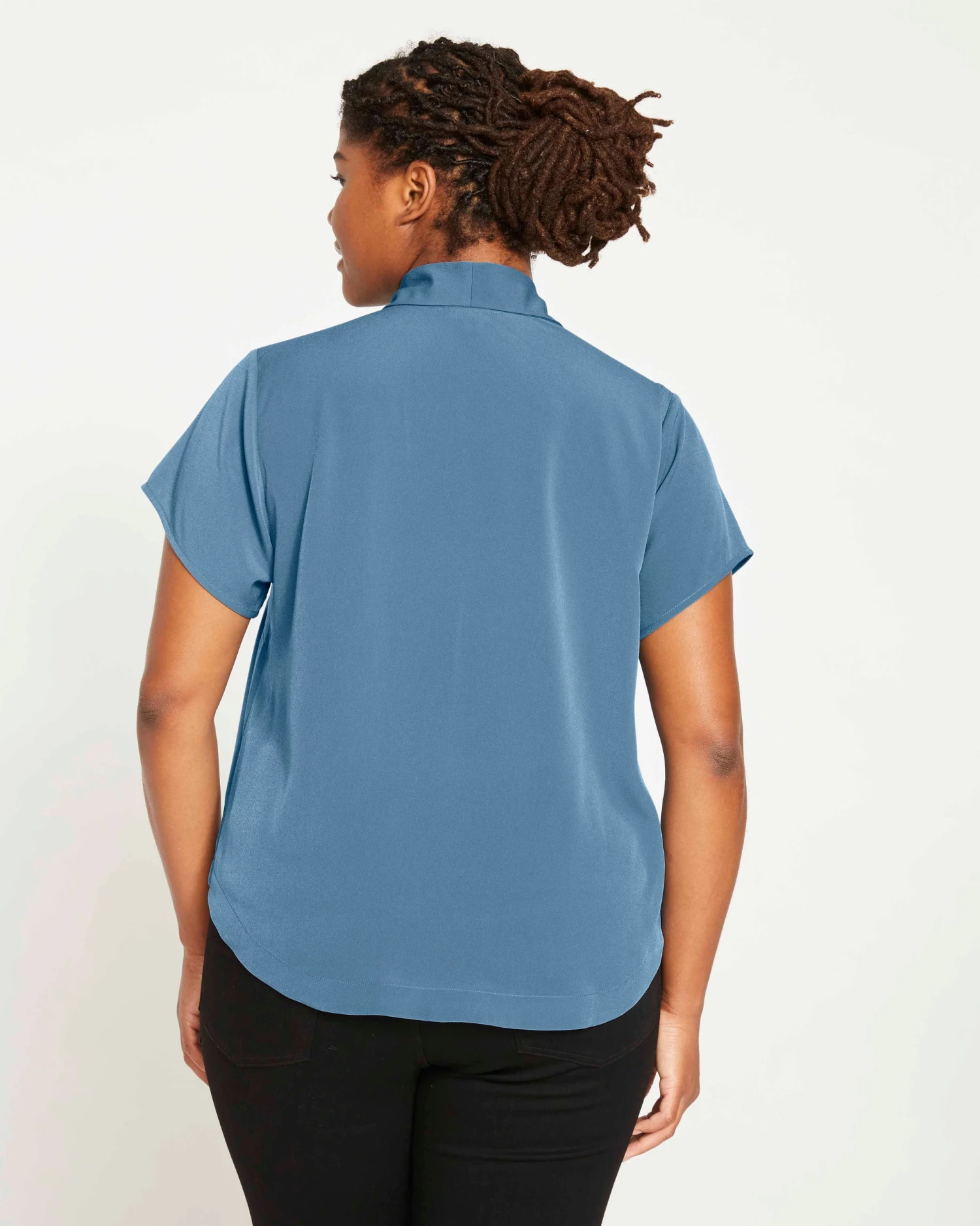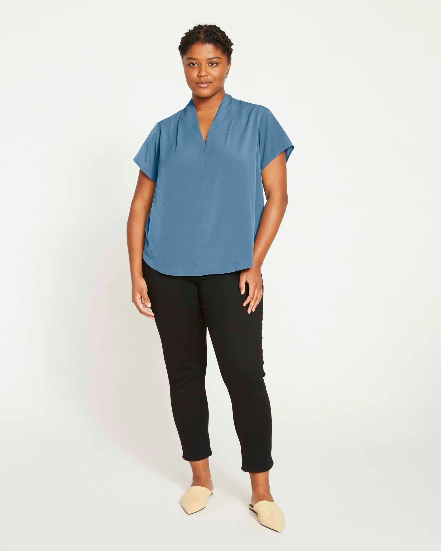 This fluid V-neck blouse will skim and float over your body. Elegant and tailored with the ease of a tee, it was constructed with comfortable stretch from an extra special, washable crepe de chine. We love the soft volume that flows down from the pleats at the neck and the elegant trim finishes.