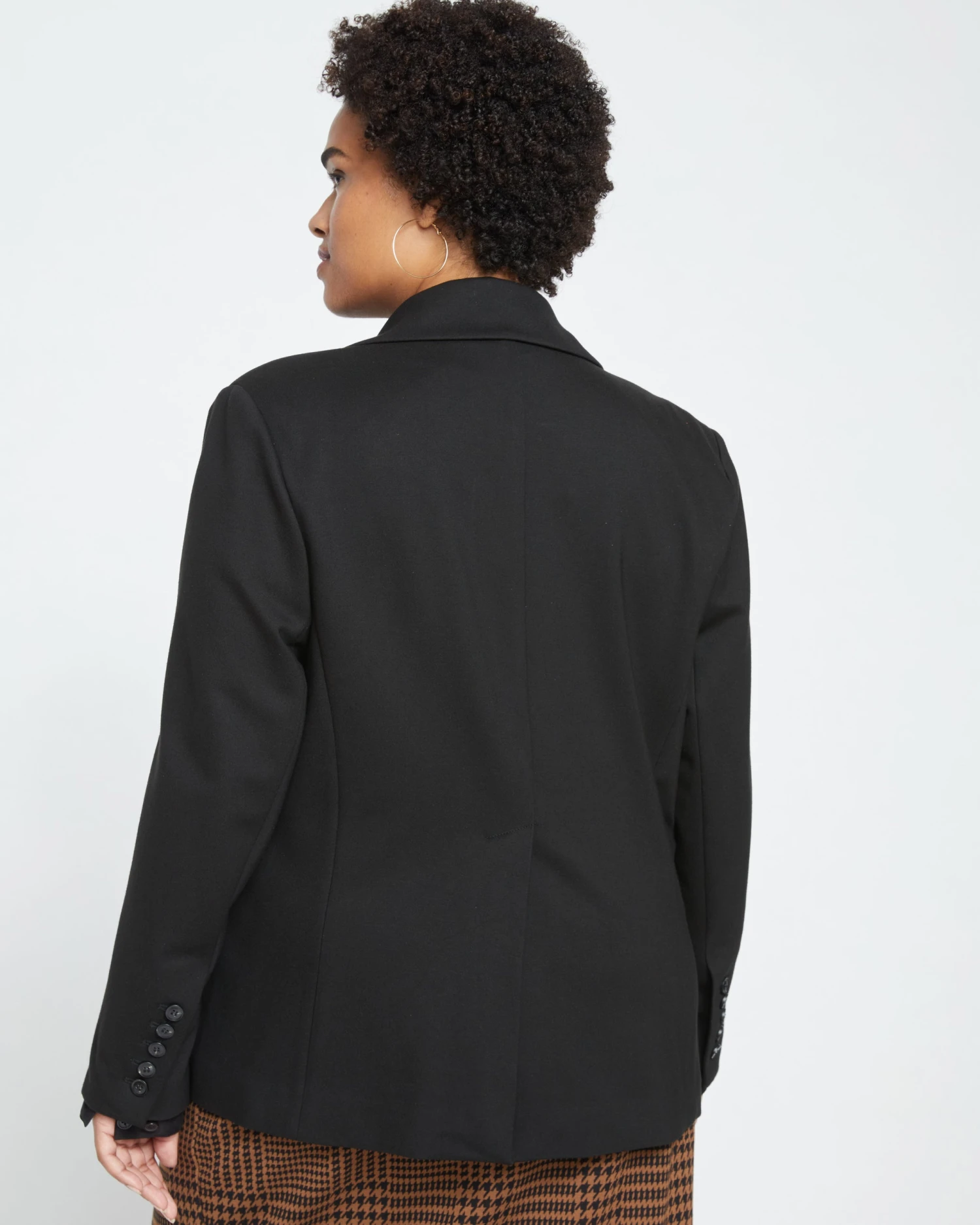 Modern meets of the moment. This double-breasted blazer is essential. The soft and stretchy feel balances the structured look—it’s made from our premium mid-weight Ponte fabric that everyone loves for its comfort and versatility. The proportions were perfected to suit many body types, and allow you to easily wear this jacket open or closed. If you’re looking for a curvy fit, this silhouette features princess seams and the most waist suppression of all our blazers. At the same time, the bracelet sleeves make this a petite-friendly style and the elongated back vent makes it comfortable for many different body types. Half lined. Lined through the front and sleeves with butterfly lining at the back.