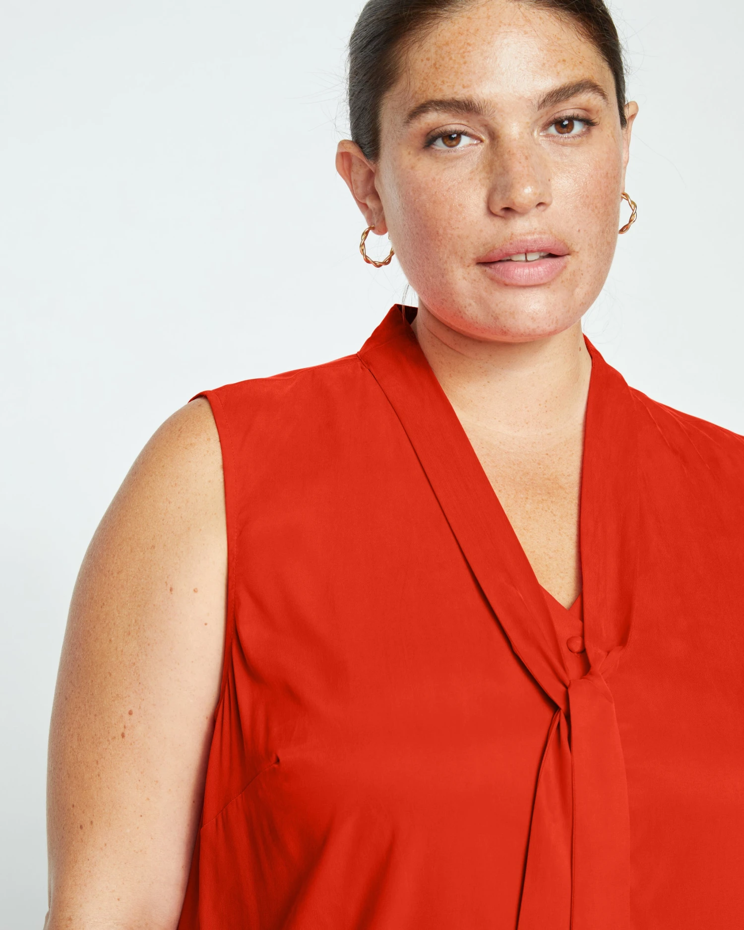 Fall in love with this romantic sleeveless top. Made from our stretch cupro, it feels smooth as silk and will keep you feeling cool. It features a neck tie that you can wear fastened or open and a full placket with fabric-covered values. This style screams tropical getaway.