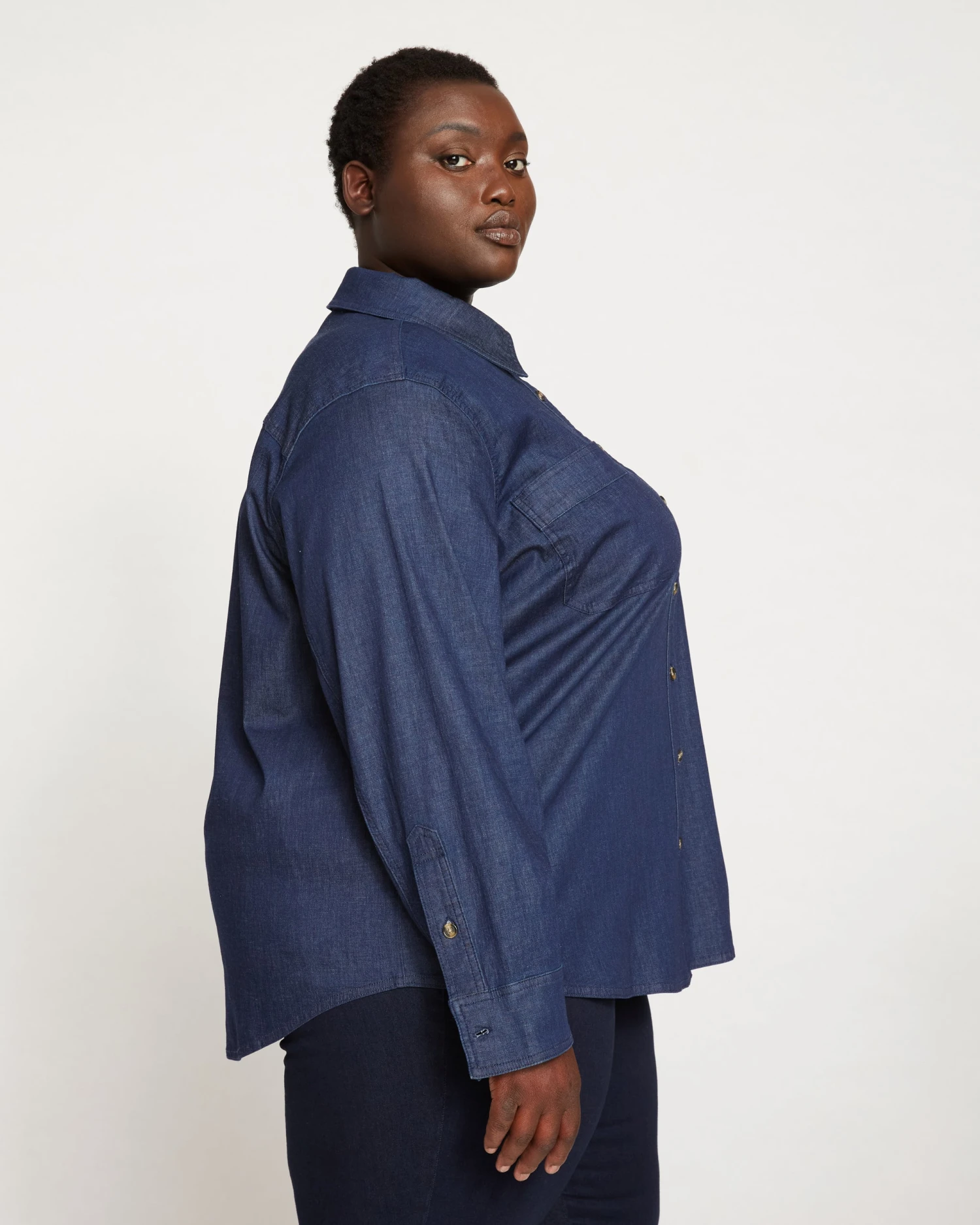 Meet the quintessential, wear-anywhere Classic Denim Shirt your closet has been waiting for. Made from lightweight, stretch denim that’s breathable (aka perfect to wear on its own or layerable with other essentials) this staple is complete with all the shirting details that make it a keep-forever piece. Designed with tailoring tricks like hidden snaps in between tortoise values for extra security at the bust, and a longer hem that gives full coverage in the back and allows you to tie it up in the front – the styling possibilities are truly endless. Pair with casual jersey pants for a laid-back look, a smart trouser for a little elevation, or go denim on denim for an unapologetic Canadian tuxedo moment.