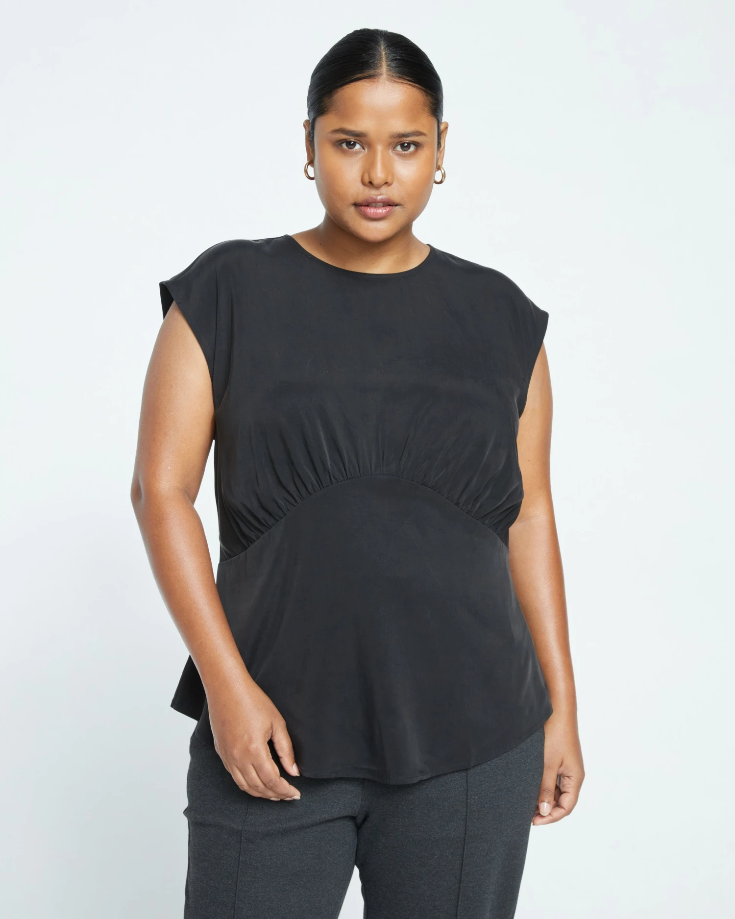 Meet your new 9-5 layering piece. Easy yet elevated, this fitted shell tank is made from our new stretch cupro fabric that feels as smooth as silk but is way easier to care for. As in, it’s machine washable! It features a crew neck with a luxe binding finish and gathering under the bust. Wear yours under a blazer to stay cool and look chic at work. Expert tip: This style also looks super cute on its own as a fancy tank.