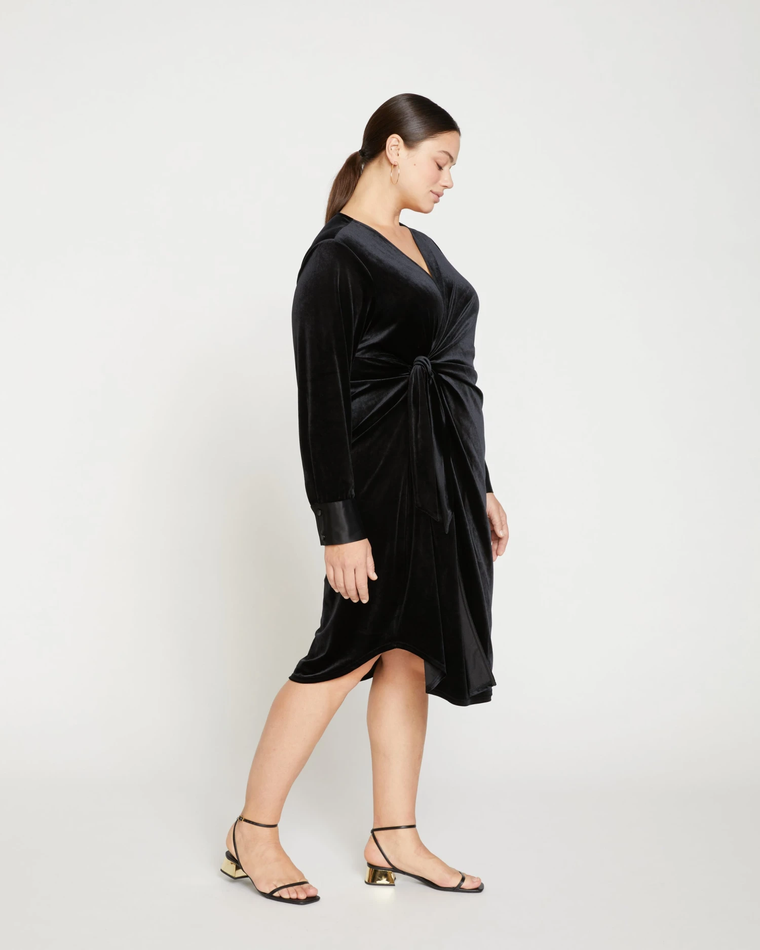 Wrap yourself up in this luxurious stretch velvet dress. It features functional ties inside and out with a V-neckline and tonal double luxe cuffs. Additionally, it has a curved hem with side slits. There’s a sultry, vintage ‘le smoking’ vibe to this style and we’re obsessed.