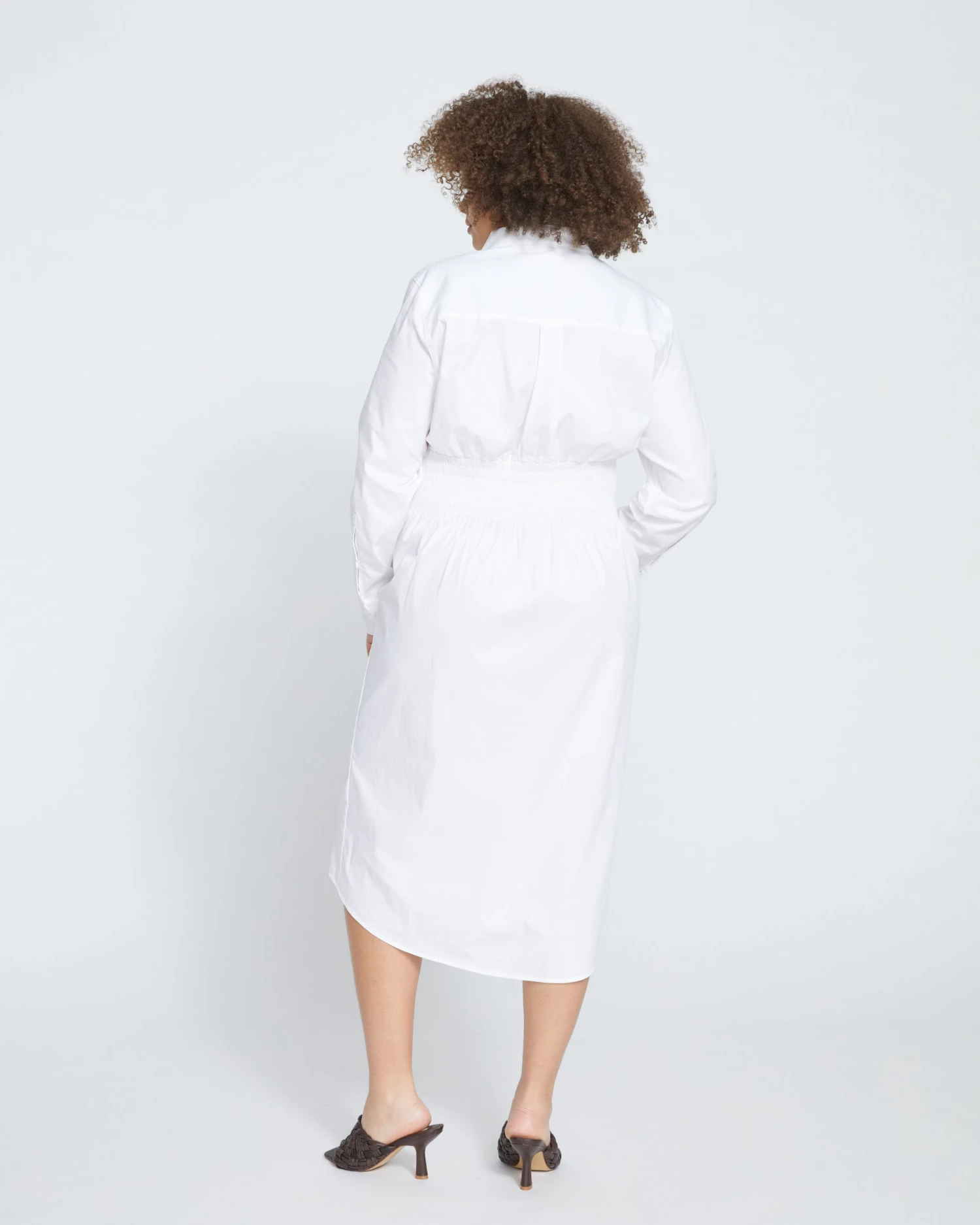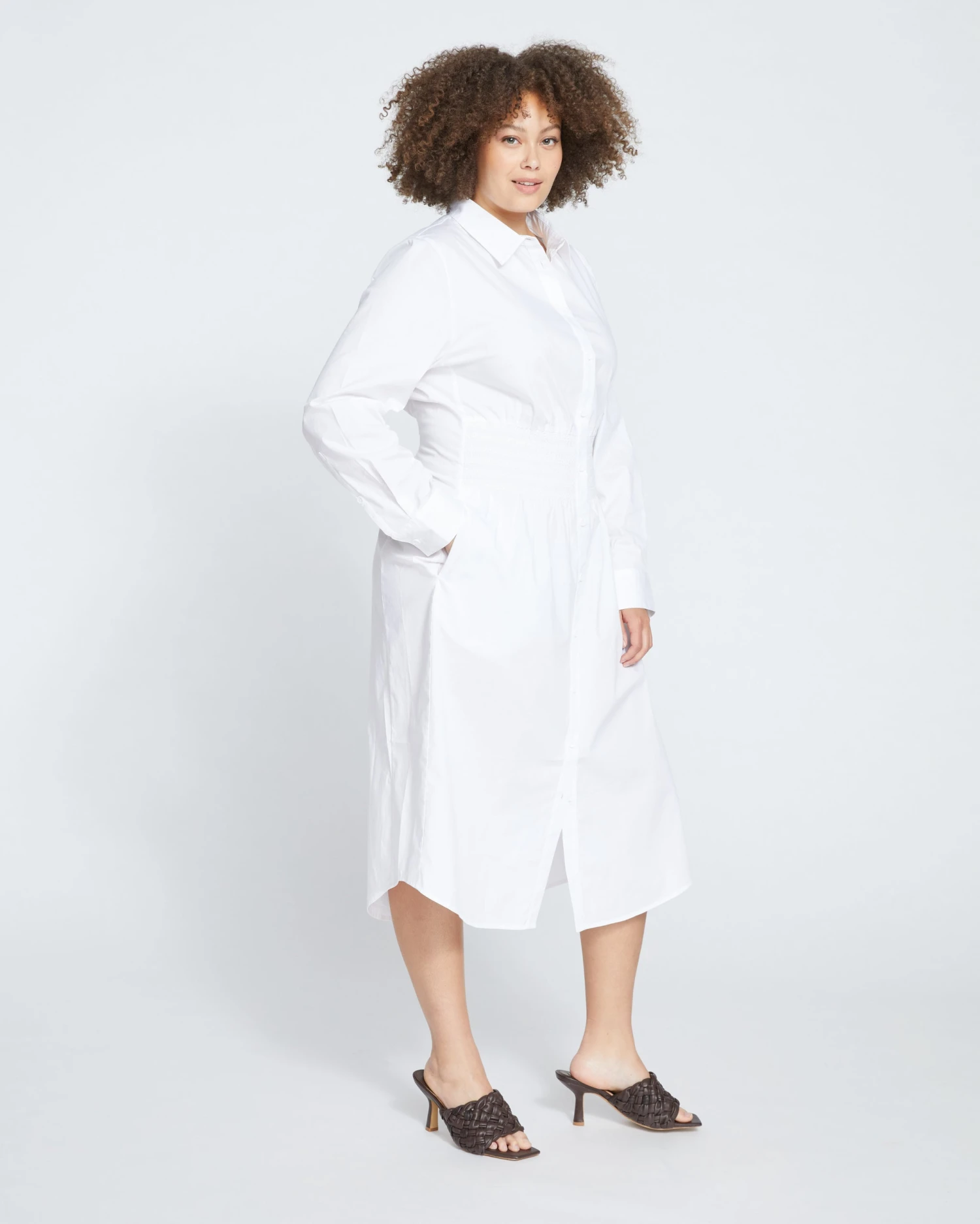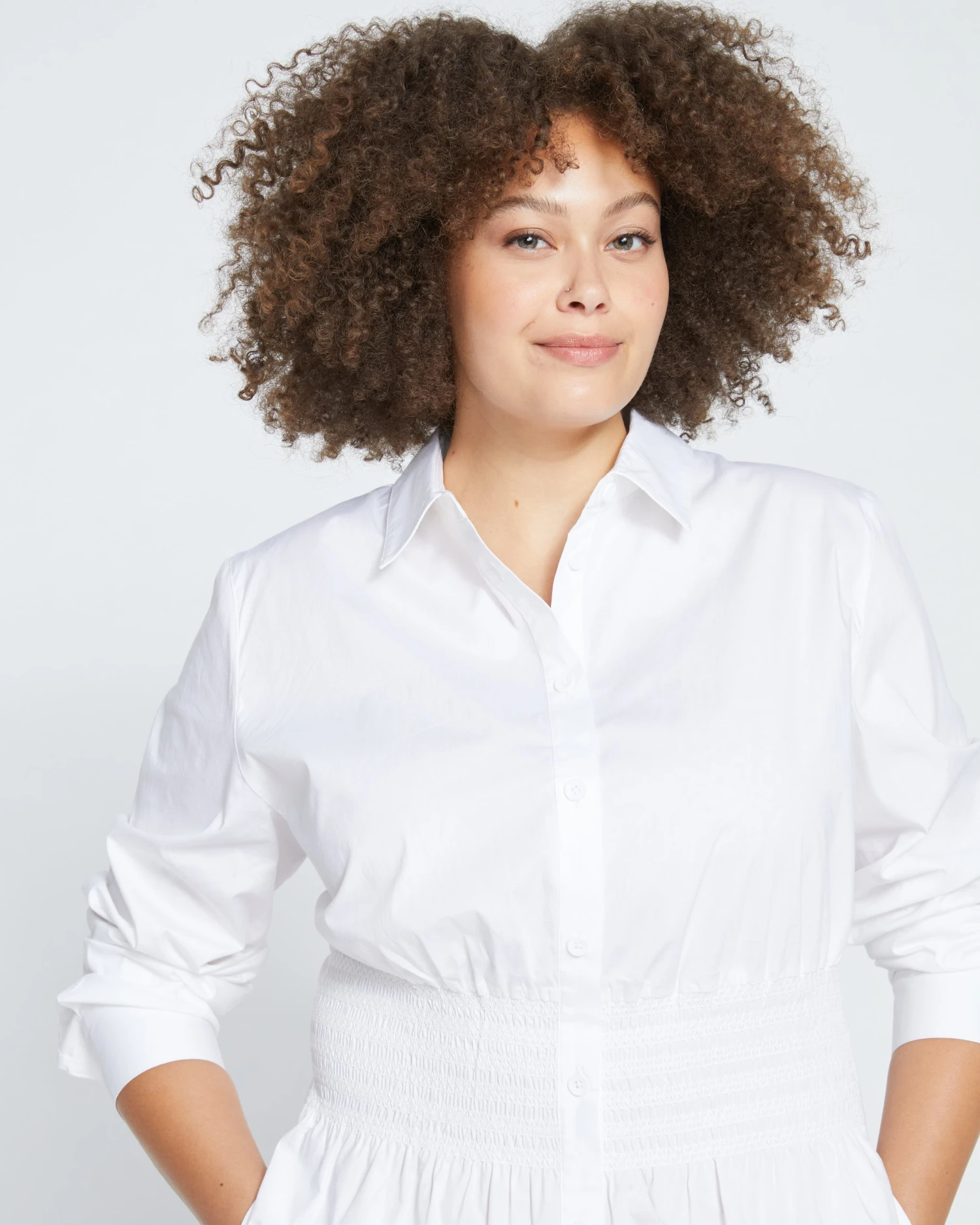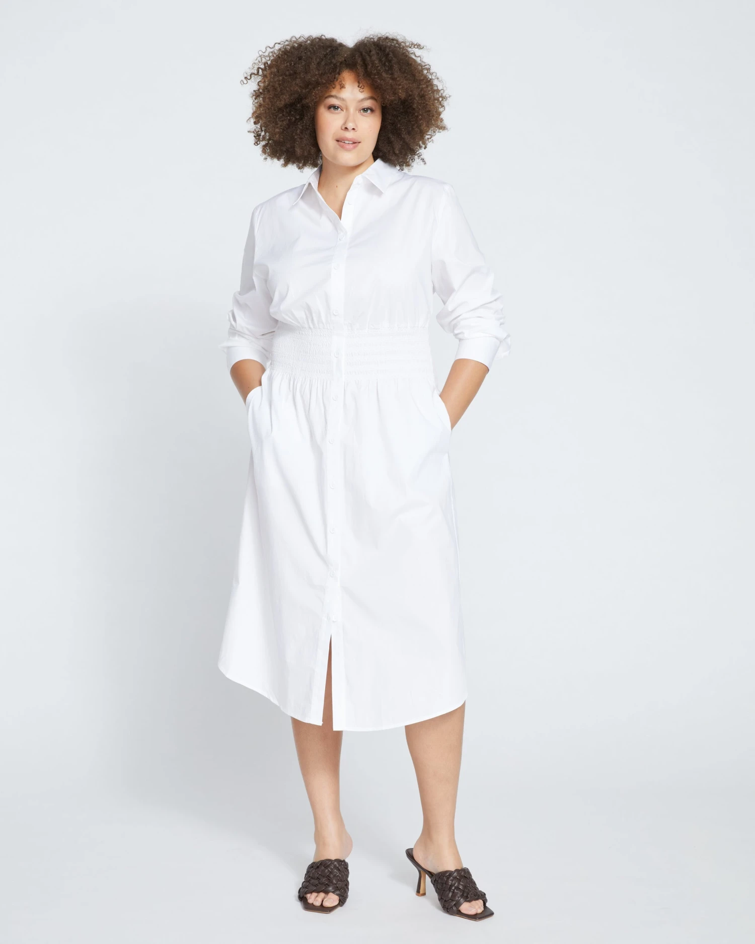 Did you just step off your private helicopter and onto your beachfront patio, or is it just the shirt dress? Perfectly classic with a chic update, this stretch poplin dress features smocking to comfortably cinch the waist and lend a little definition to the oversized silhouette. Additional hidden details make this piece a must-have: separate side panels to prevent pulling and hidden snaps between each value. You’ll live in this one.
