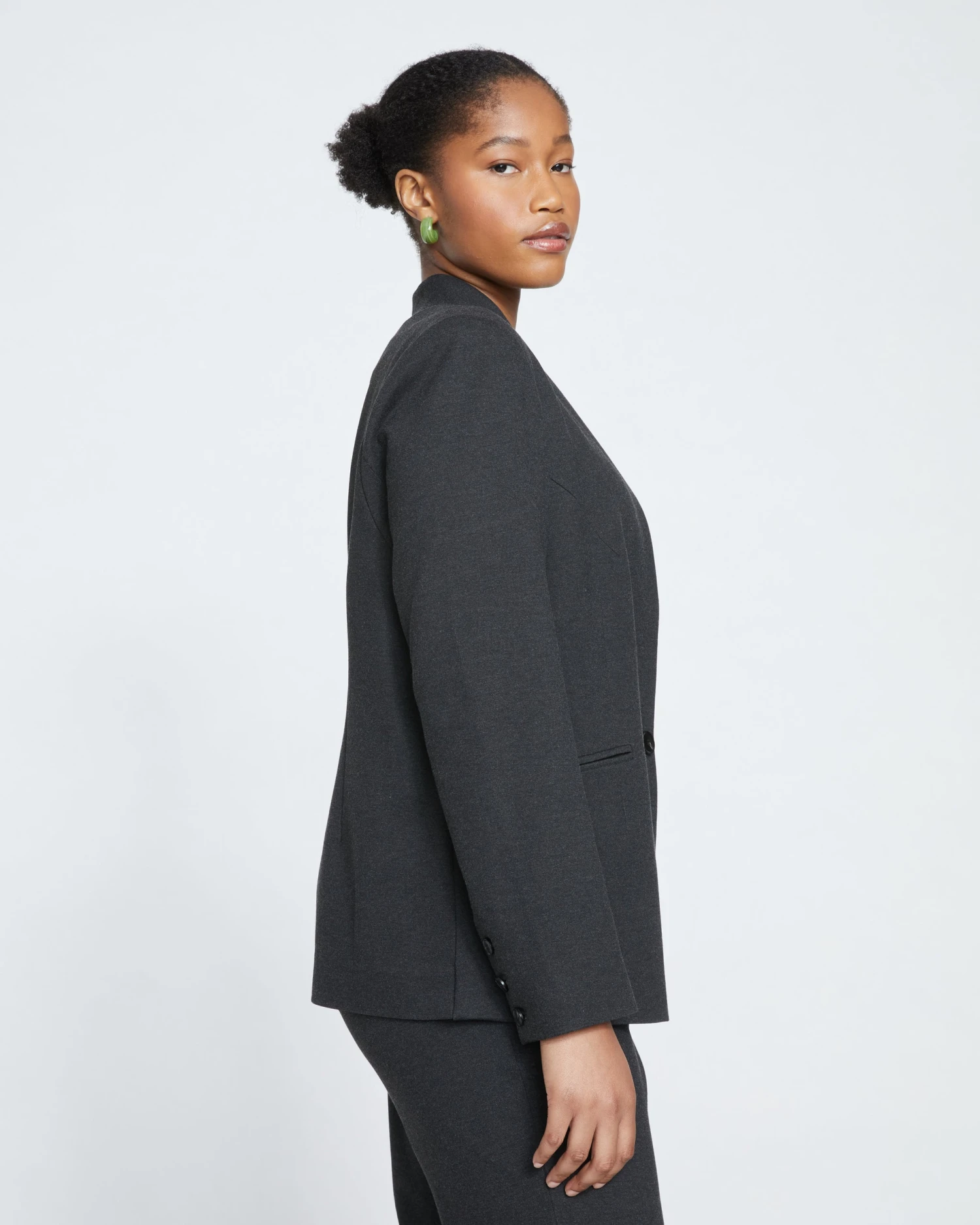 Elegant, refined, timeless. This collarless blazer is sharp without being overwhelming, thanks to the very slight shoulder pads. The soft and stretchy feel balances the structured look—it’s made from our premium mid-weight Ponte fabric that everyone loves for its comfort and versatility. The proportions were perfected to suit many body types, and allow you to easily wear this jacket open or closed. Plus, the elongated back vent makes it comfortable for all. Half lined. Lined through the front and sleeves with butterfly lining at the back.