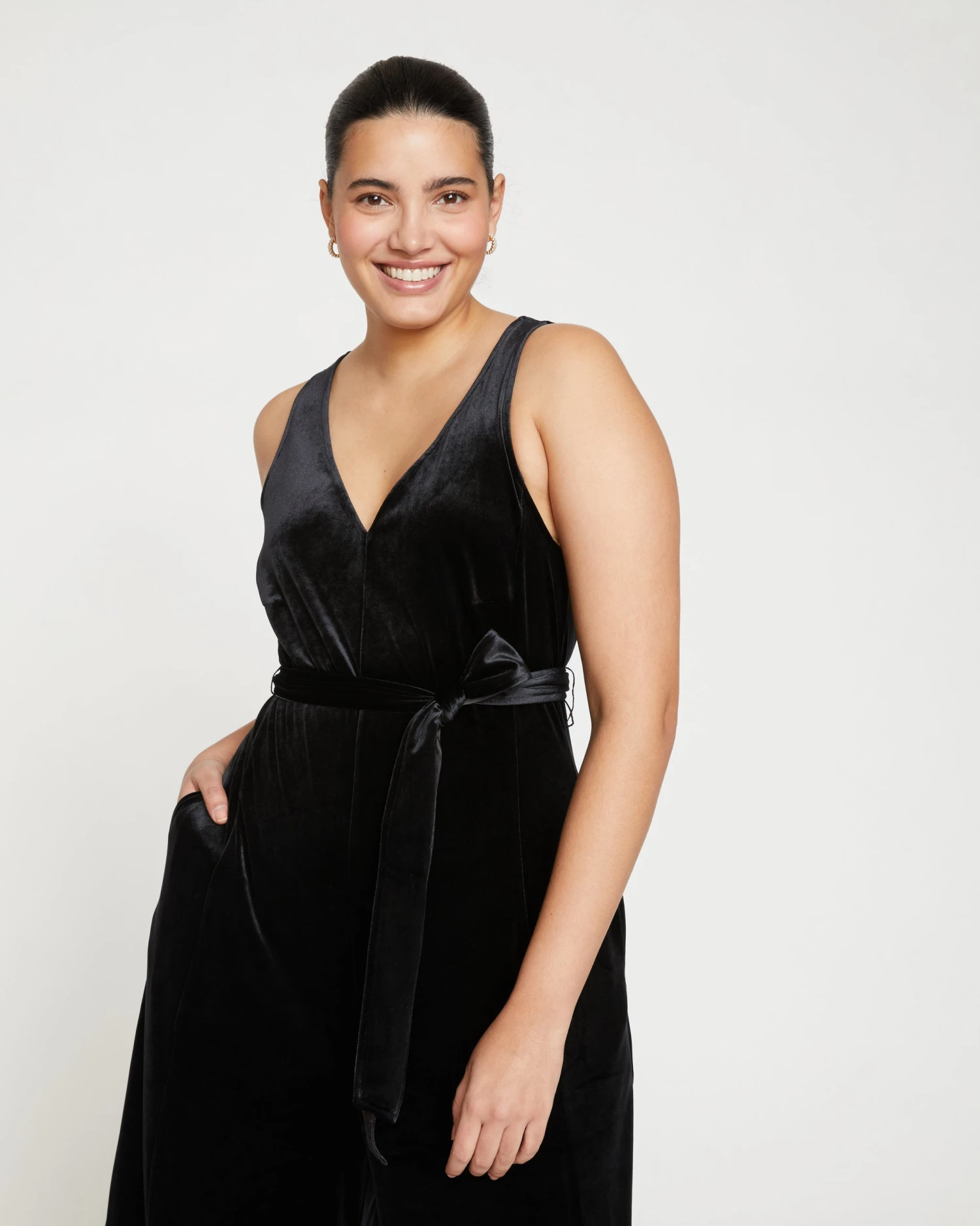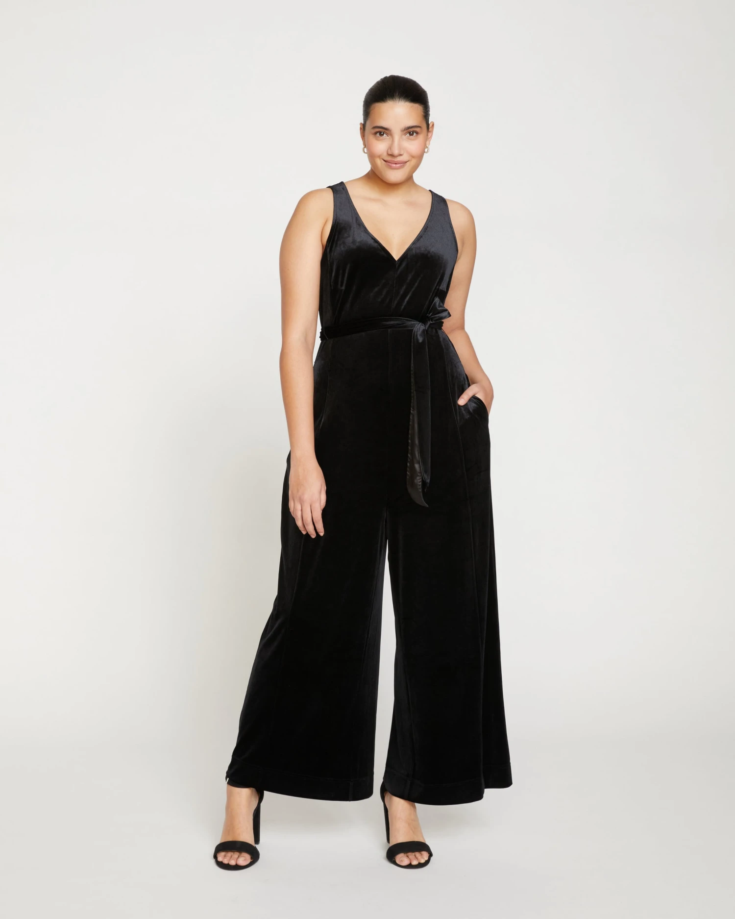 This is your holiday look in one single piece. Extremely lush and flowy, this stretch velvet jumpsuit is perfect for everything from date night to ringing in the new year at midnight. Key details include the V neck and back, satin-back self-belt to cinch the waist, princess seams, and premium finishings. It’s unlined but the interior is a smooth knit that feels great against your skin. Wear it layered with a blazer and try a mesh top or turtleneck underneath. So chic!