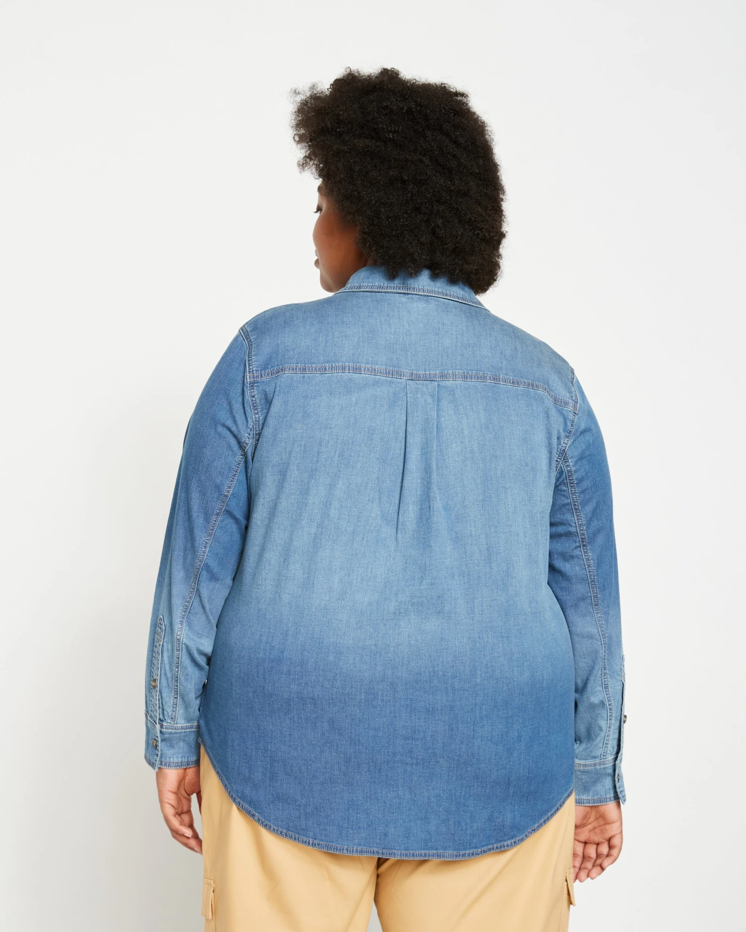 Meet the quintessential, wear-anywhere Classic Denim Shirt your closet has been waiting for. Made from lightweight, stretch denim that‚Äôs breathable (aka perfect to wear on its own or layerable with other essentials) this staple is complete with all the shirting details that make it a keep-forever piece. Designed with tailoring tricks like hidden snaps in between tortoise values for extra security at the bust, and a longer hem that gives full coverage in the back and allows you to tie it up in the front – the styling possibilities are truly endless. Pair with casual jersey pants for a laid-back look, a smart trouser for a little elevation, or go denim on denim for an unapologetic Canadian tuxedo moment.