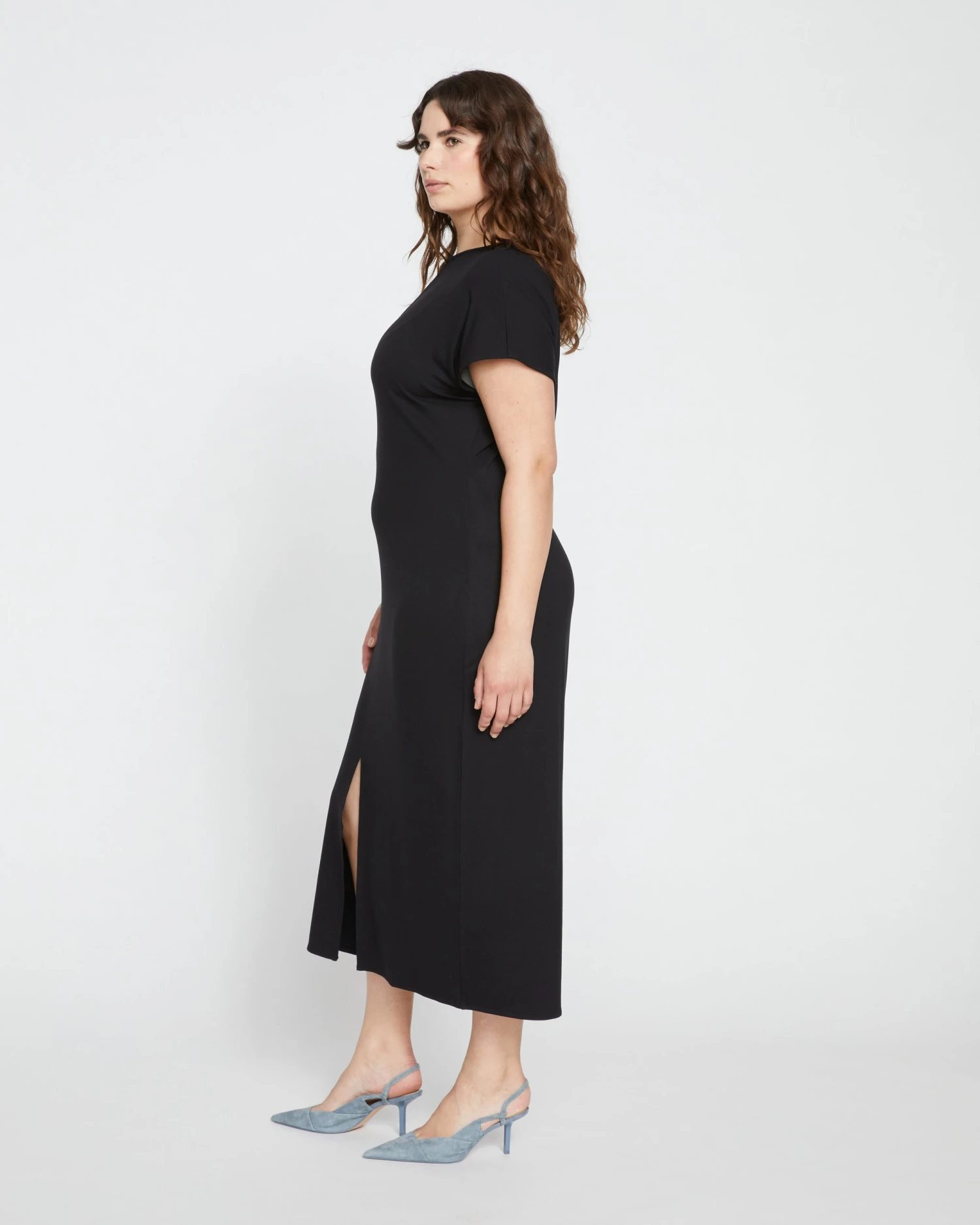 This is your spring-summer shift dress. It’s made from our softly structured divine jersey that has a luxe look and feel. Elegant and classic with the comfort of your favorite pajamas. This sleek dress features a beautiful drape and will move with you easily. Key details include the hook and eye neckline, that can be worn open or closed, and a front slit from the hem. Wear this one from your desk to your dinner table. Cheers to versatility!
