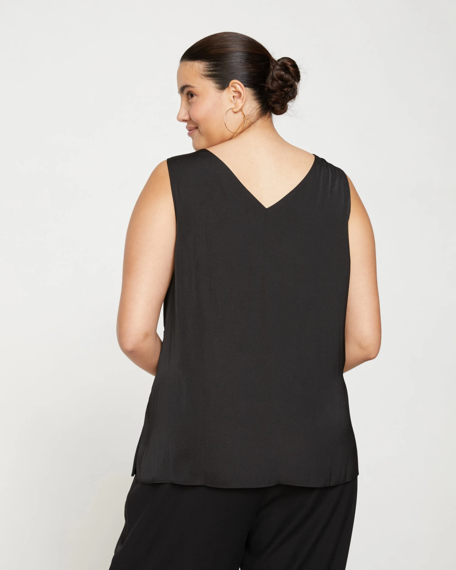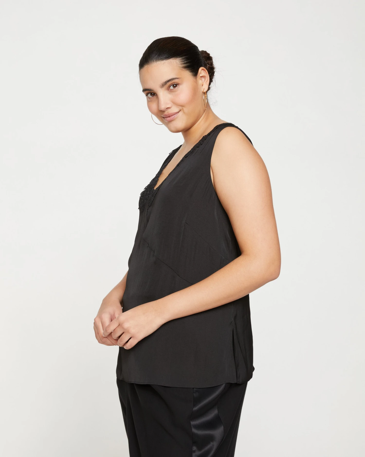 Your fanciest lingerie but make it a top. Sweet and elegant, this sleeveless stretch satin blouse features delicate lace detailing along the neckline and a string to cinch the waist. Dress up your jeans and wear it with pants to look sophisticated in the evening.