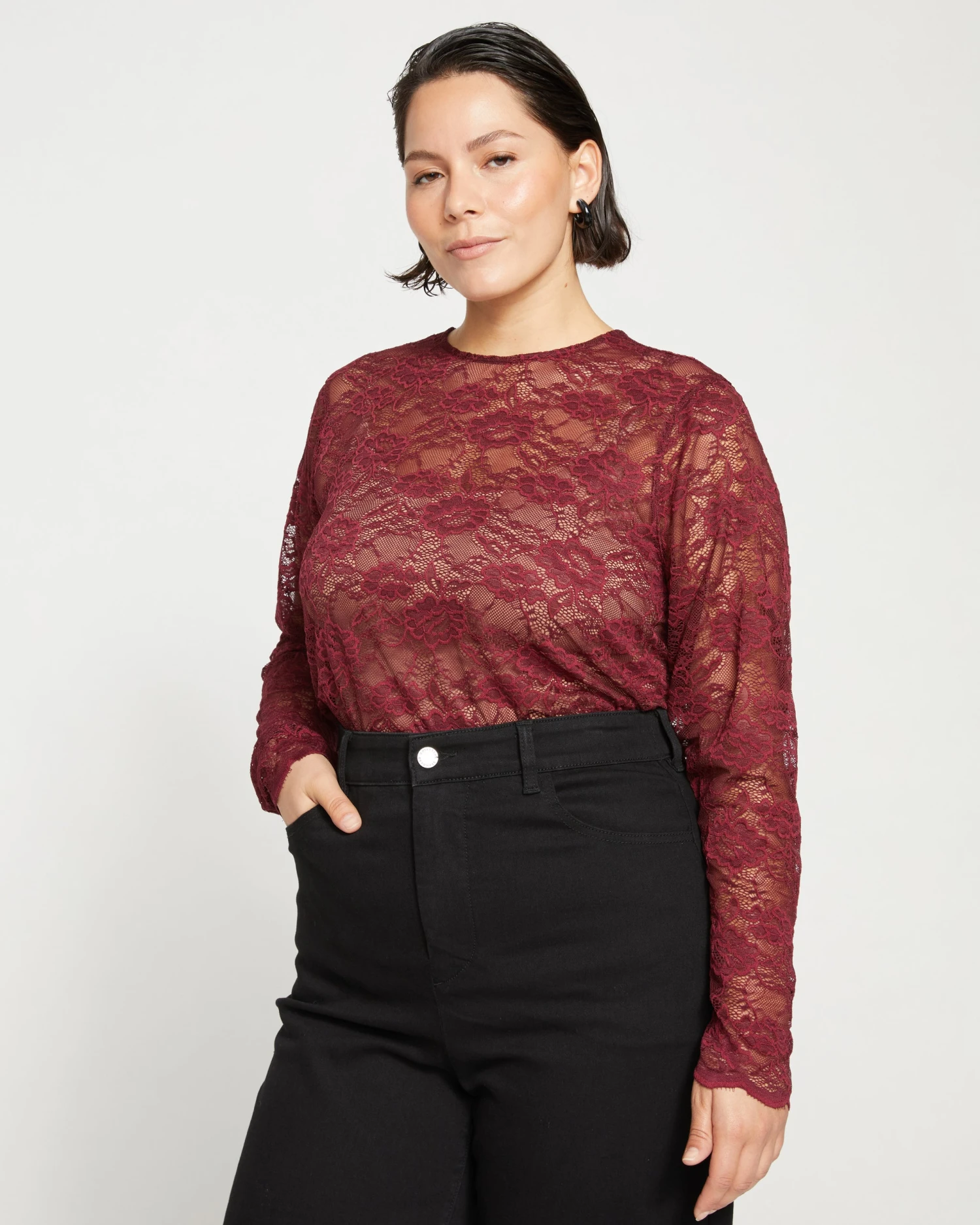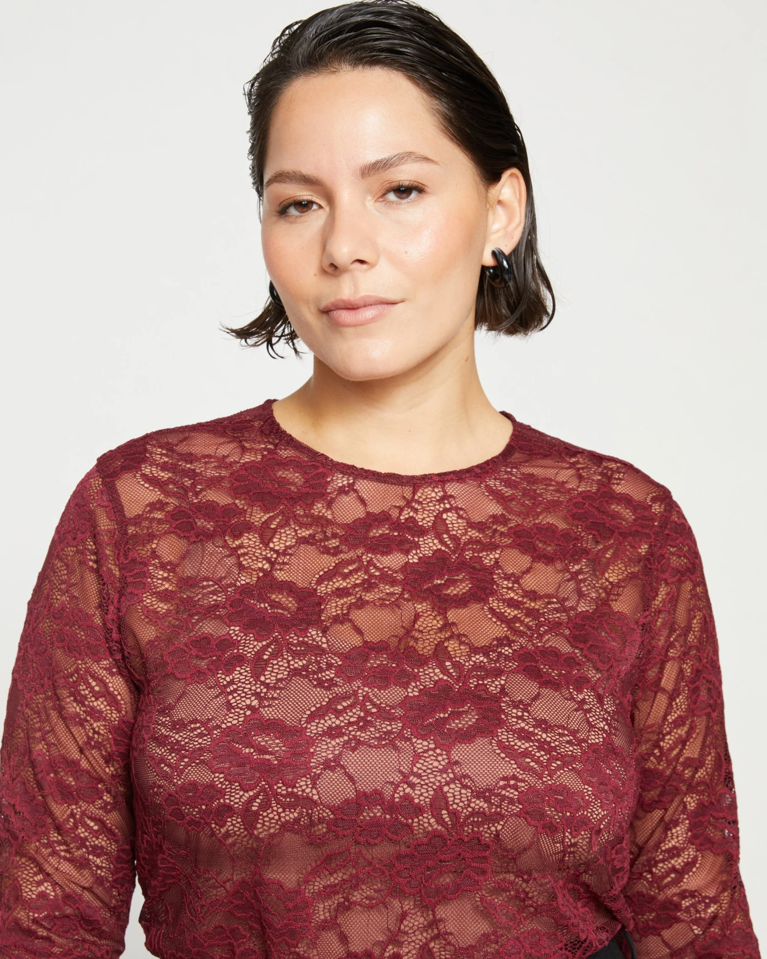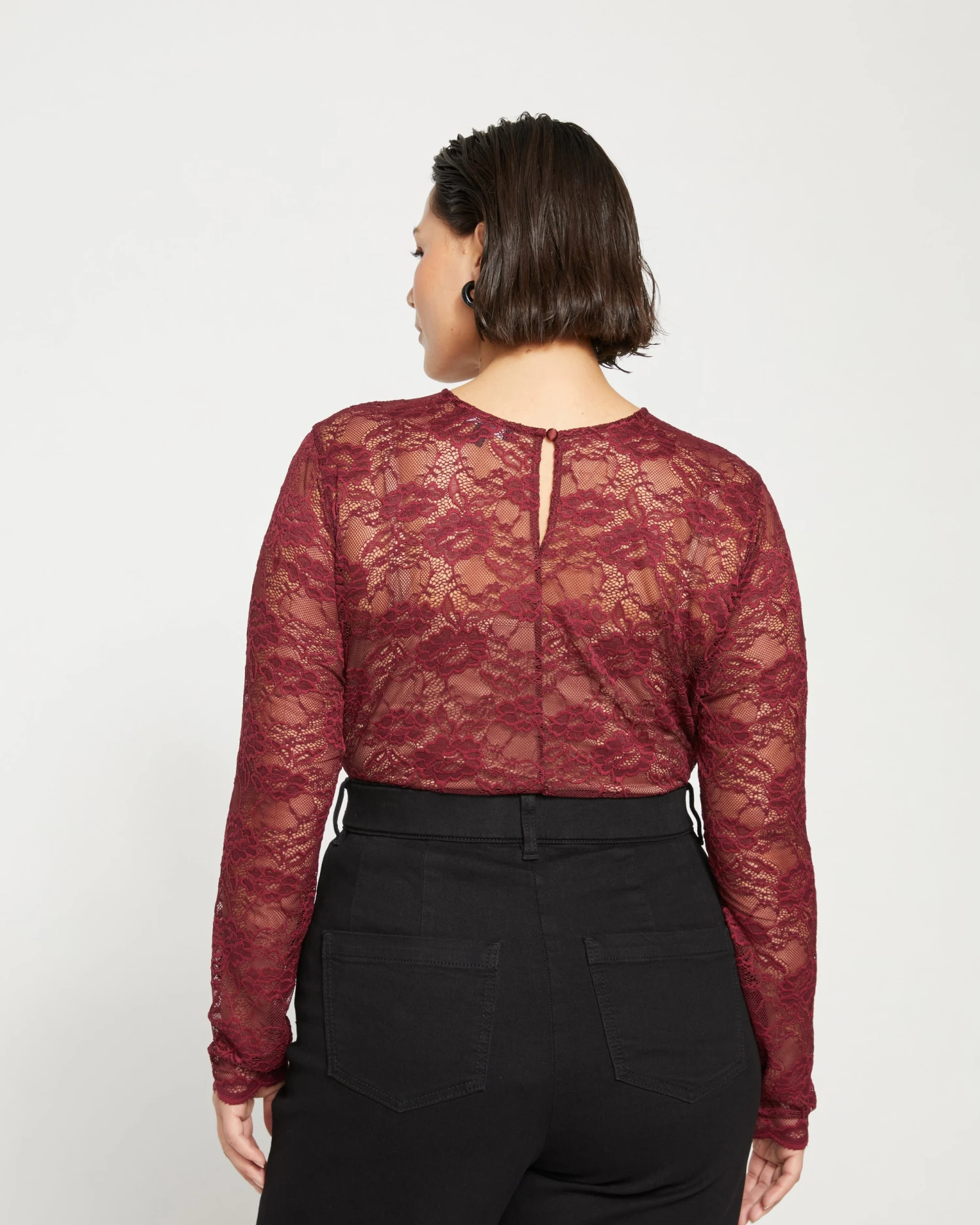 We’ve recreated your favorite mesh top in elegant stretch lace. Add a little romance to your look with this sheer piece. You can layer it over a tank or wear it alone under a cardigan or blazer. The lace is soft and smooth and feels cool to the touch.