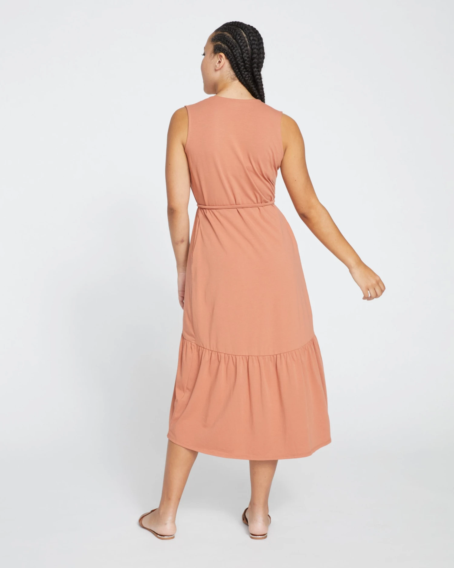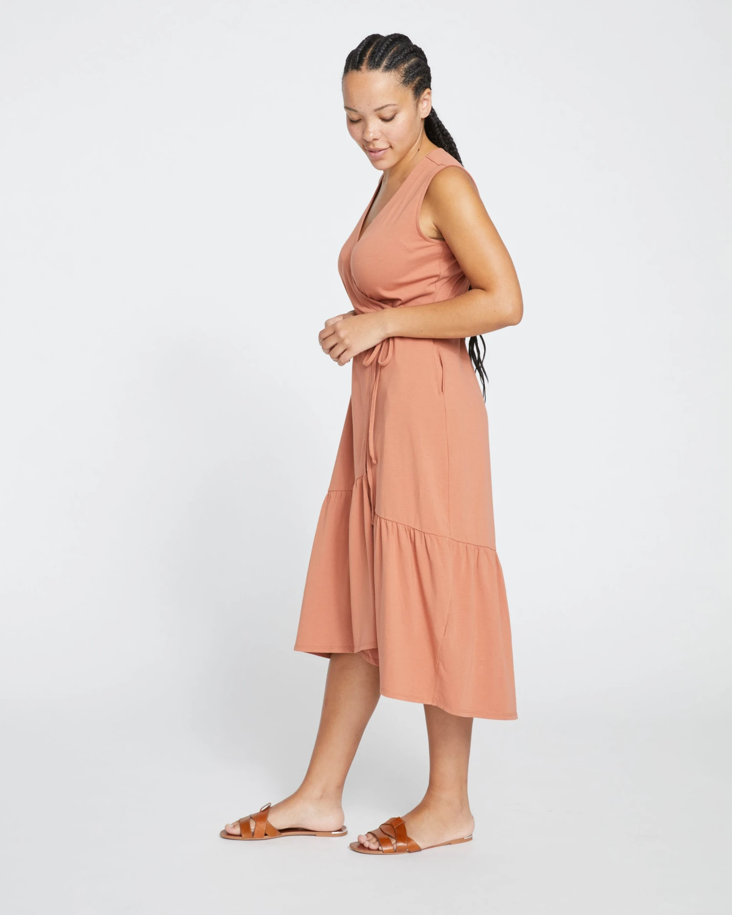 You have to take this style for a spin. It’s the made-for-movement dress of our dreams. If you’re searching for a versatile day-to-night favorite, this tiered jersey wrap dress works for every occasion, from afternoon brunch to cocktails and dancing. The angles of this dress were designed to frame your silhouette, and the ruffles add texture without unwanted volume. There’s also a thin fixed tie to cinch at your natural waist. Additional details include the V-neckline, pockets, and a hi-low hem that hits below the knee.