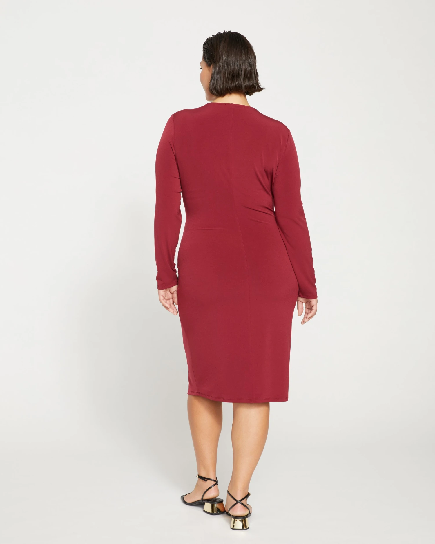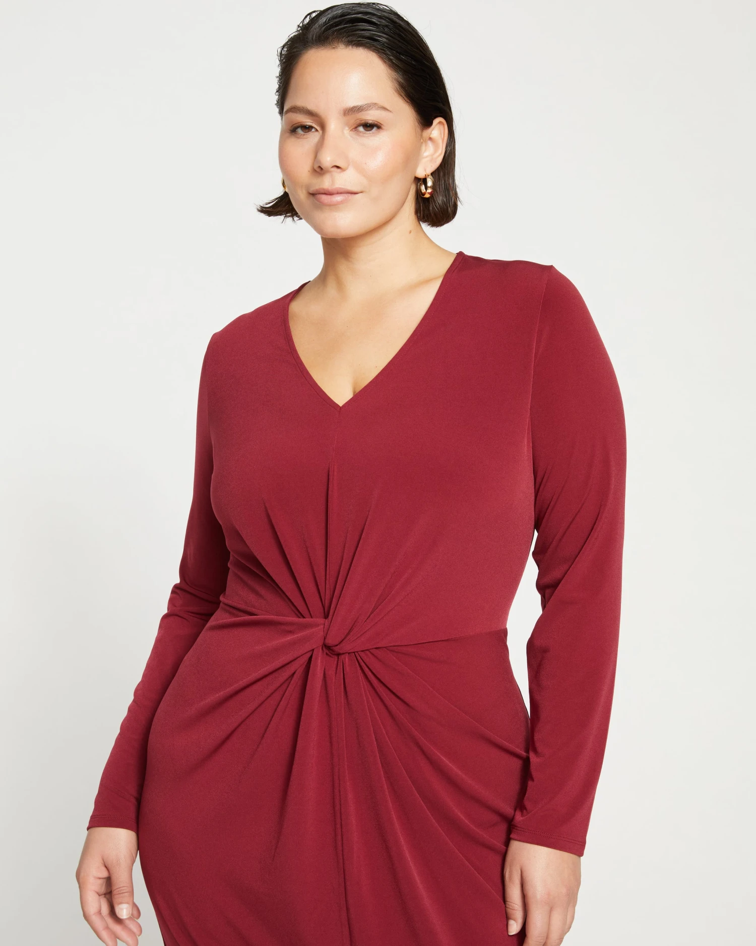 Get it twisted. As in, you need this dress. It’s made from our velvety-cool jersey that’s luxuriously smooth, soft, and silky. The body-hugging fit features a fun twist detail at the waist for gathering through the body. Additional details include the V-neckline and long set-in sleeves.